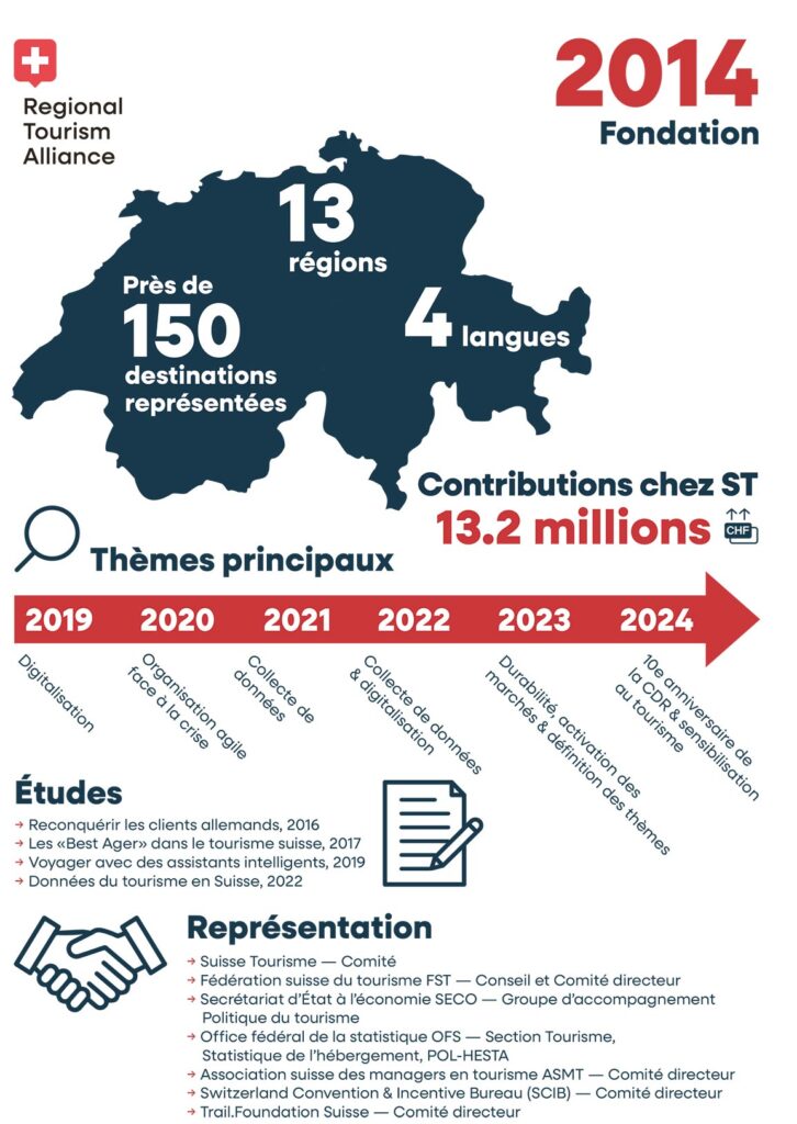Depuis 2014, la Regional Tourism Alliance sert de groupe de réflexion pour les régions touristiques suisses. Les différentes régions jouent un rôle central dans la commercialisation et la promotion. Bien que les différentes méthodes de travail et les mandats des régions touristiques suisses diffèrent parfois nettement, les différents défis dépassent les frontières des cantons et des régions. Grâce à la Regional Tourism Alliance, des synergies peuvent être créées et des solutions adaptées trouvées à l’échelle nationale.